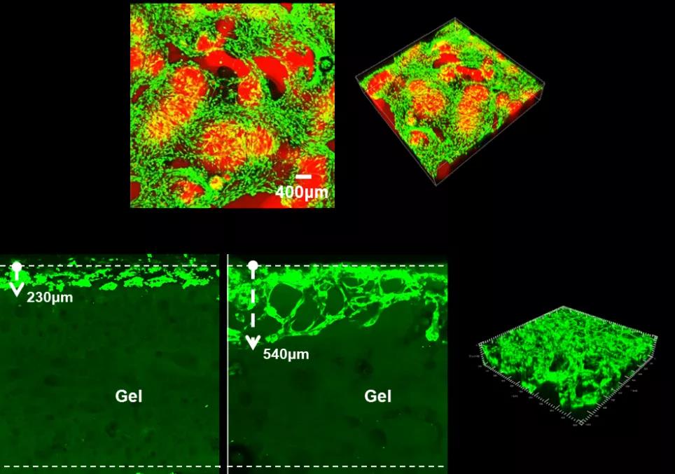 在凝膠表面進行細胞培養時,多孔GelMA同樣具有優秀表現,貫通的孔道結構使接種在表面的細胞呈現向凝膠內部遷移的趨勢,第9天細胞遷移深度可達約540μm。(圖4)