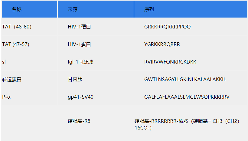 常見穿膜肽1型人免疫缺陷病毒轉(zhuǎn)錄激活因子TAT(人類免疫缺陷病毒1轉(zhuǎn)錄激活劑,HIV-1 TAT)是首先被發(fā)現(xiàn)的細胞穿透肽,它具有一種無毒的,高效的方式進入細胞。