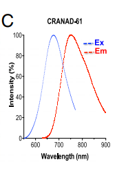 其他說明:密封狀態下保質期半年【主要優勢】該分子探針不僅能在宏觀水平上檢測腦中ROS的濃度,還能通過雙光子成像在微觀水平上檢測Aβ斑塊周圍的ROS濃度。CRANAD-61與AD大腦中的ROS發生反應引起光譜的藍移,該波長的藍移在整體動物成像時表現為一種“可見”至“不可見”的轉化,而在雙光子成像時該現象可用于鑒別Aβ斑塊是否處于“活性”狀態