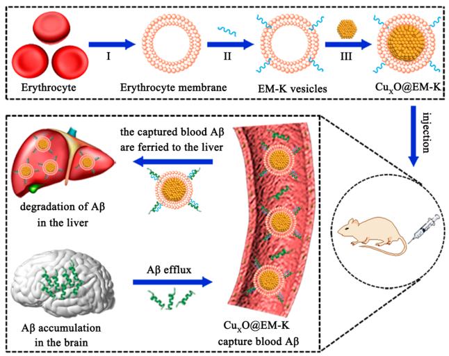 組成:紅細胞膜+Aβ靶向五肽KLVFF+CuxO納米酶