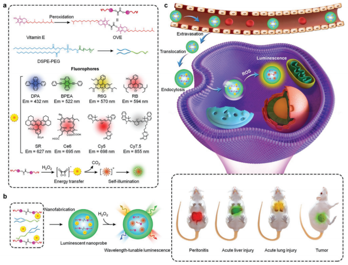 其他說明:密封狀態下保質期半年【主要優勢】1、以VE為原料,制備的OVE可以作為能量的供體,被H2O2觸發后形成中間體并將能量轉移給熒光染料并點亮其熒光;2、OVE可以與不同的熒光染料相結合,實現了波長可調;3、該體系可成功實現對多種炎癥模型和腫瘤模型的成像,且OVE NP的緩慢水解和熒光染料的持續釋放使得該體系能夠實現長時間的持續發光;4、分解后的OVE以VE的形式存在,使得該材料具有優異的生物相容性和安全性;5、該研究有助于實現在體內精確定量和實時跟蹤與炎癥和氧化應激相關的不同疾病中的活性氧水平,加深對許多疾病的分子和細胞機制的理解。