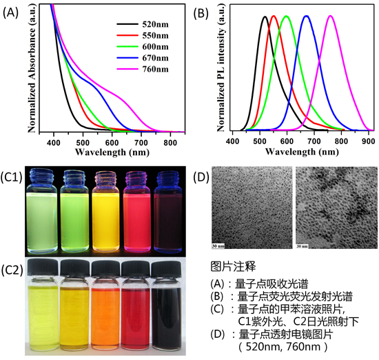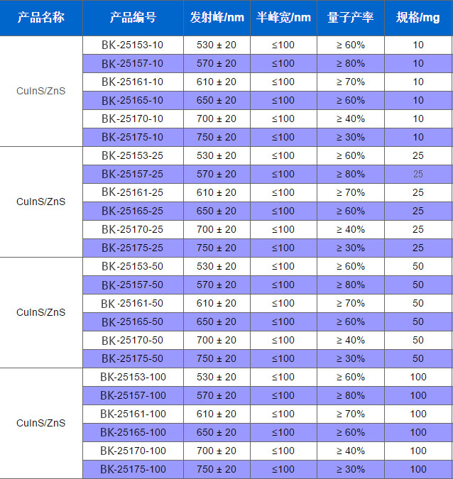 蘇州北科納米科技有限公司生產的油溶性CuInS/ZnS量子點產品是以CuInS為核心,ZnS為殼層,表面由疏水配體包裹的核/殼型熒光納米材料,平均的量子產率為60%,儲存時應避免陽光直射,4度密封暗處保存,可以為客戶訂制生產530nm~750nm任一波長不同克數的產品。本產品具有粒徑均一,吸收光譜寬泛,發射光譜對稱,熒光強度高而穩定等特點,可應用于太陽能電池、發光器件與生物熒光標記等領域。