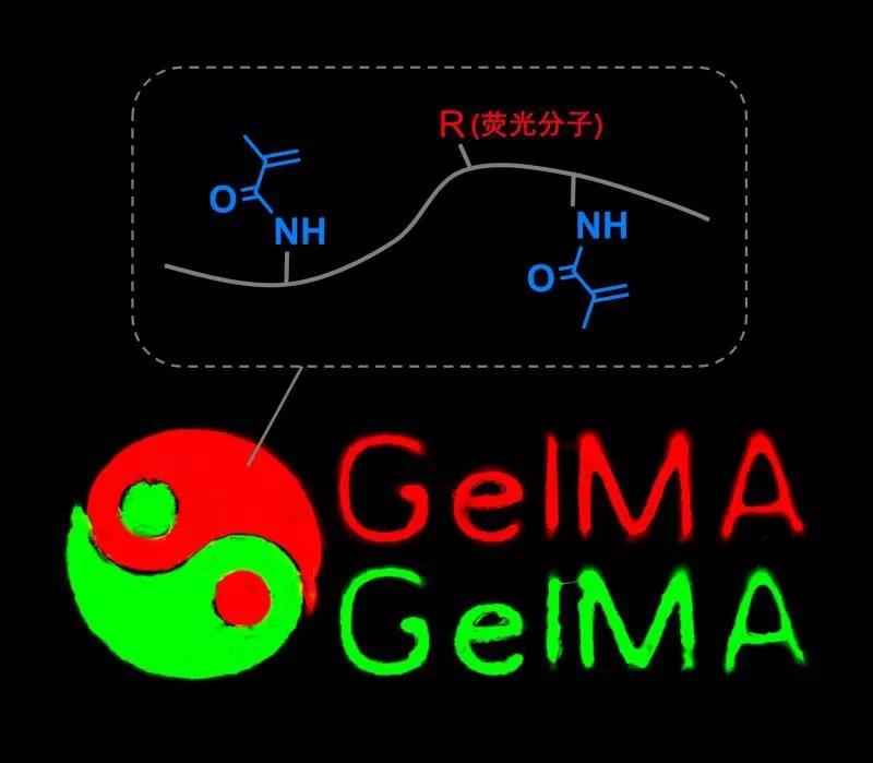 團隊研發的熒光GelMA是通過在GelMA上“嫁接”熒光分子實現的,因所嫁接熒光分子不同而具有特定的熒光顏色。此化學標記方法避免了物理混合或靜電吸附等方法中熒光分子容易擴散出體系的缺點,,同時也避免了熒光微粒成像不均的缺點。
