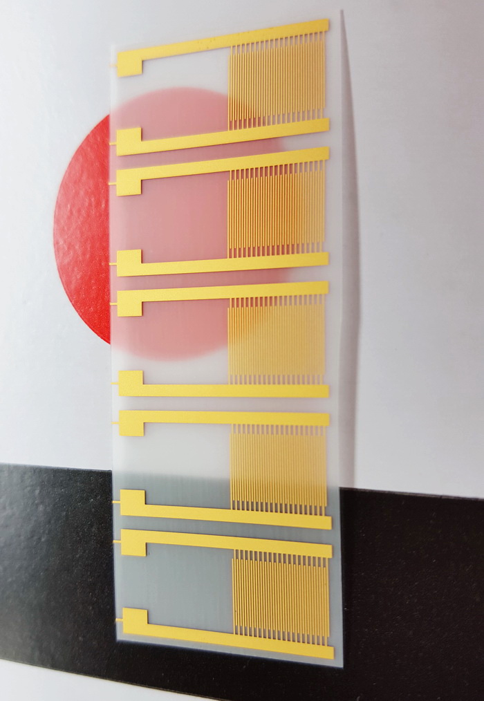 1. Substrate: Polyethylene terephthalate (PET), thickness 70um, external dimension 5mm*10mm. 2. The line width is 45um, the line spacing is 55um, and the finger length is 3.3mm. Interdigital pairs: 15 pairs (30 fingers). 3. The metal layer structure cu/Ni/Au has a thickness of 13um, 1.5um, and 1um respectively.