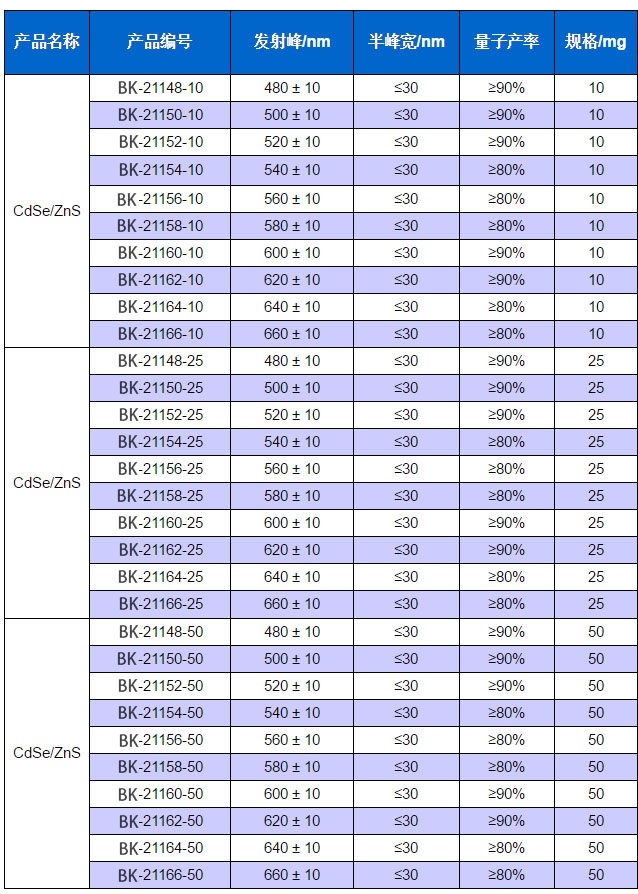 The oil-soluble CdSe/ZnS quantum dot products produced by Suzhou Beike Nanotechnology Co., Ltd. are based on CdSe as the core, ZnS as the shell, and core/shell fluorescent nanomaterials coated with hydrophobic ligands. The average quantum yield is 80 %. Avoid direct sunlight during storage and keep in a dark place sealed at 4 degrees. Products with different wavelengths from 480nm to 650nm can be customized for customers. This product has the characteristics of uniform particle size, wide absorption spectrum, narrow and symmetrical emission spectrum, and high and stable fluorescence intensity. It is especially suitable for the green and red components of quantum dot light-emitting diodes (QLEDs). It can be applied to solar cells, Light-emitting devices and bio-fluorescence labels and other fields.