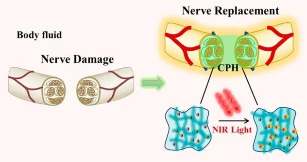 圖 1高柔性和近紅外響應導電聚合物水凝膠替代受損的周圍神經示意圖