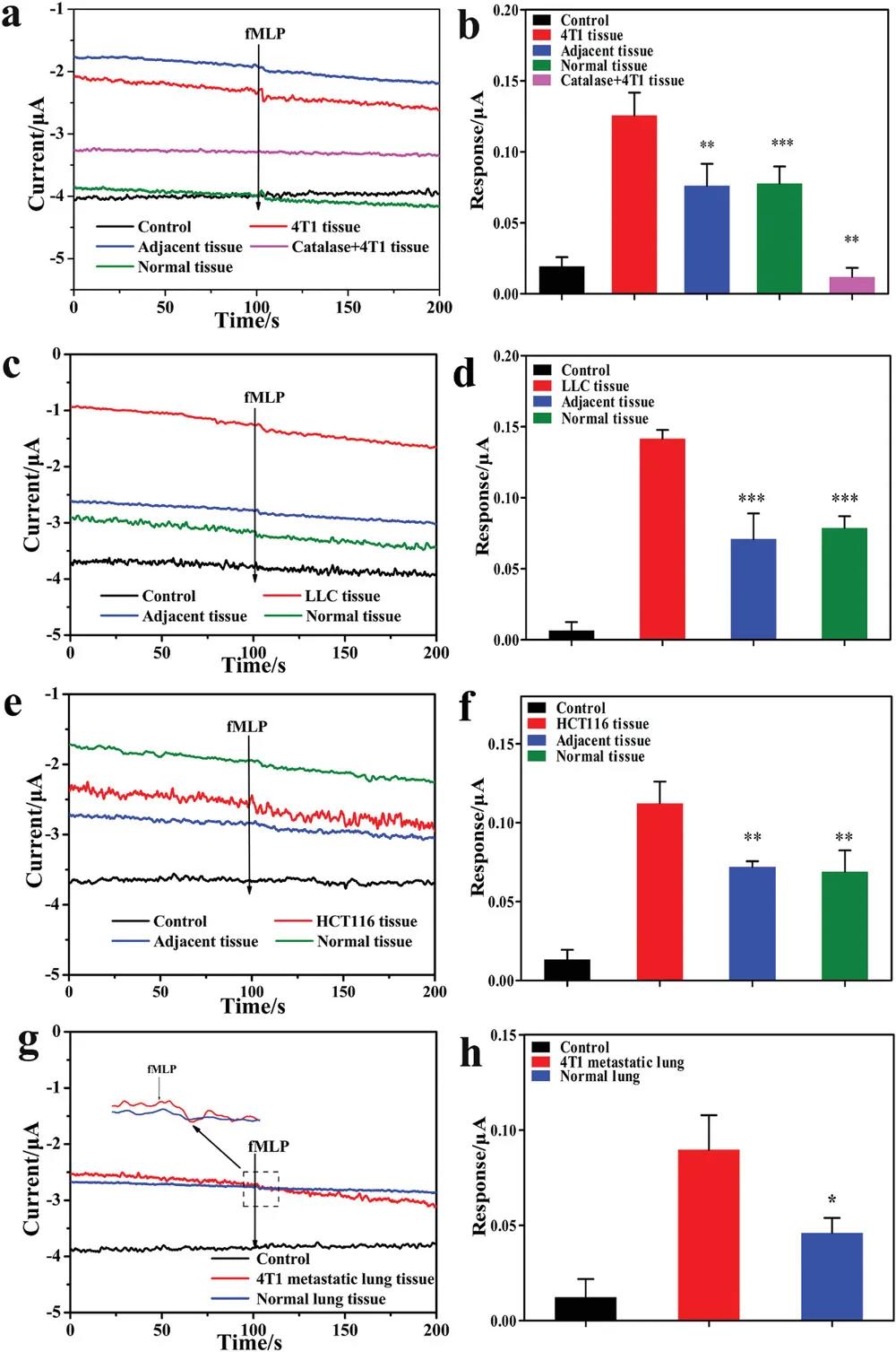 (1)該傳感器以H2O2作為分子標志物,可以成功捕獲癌細胞中的H2O2。此外,它也能有效地對腫瘤組織、鄰近組織和正常組織進行檢測。