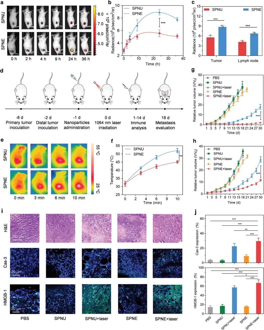在穿透深層組織的NIR - II光照射下,SPNE能夠根除腫瘤并誘導免疫原性細胞死亡,進一步誘導抗腫瘤T細胞免疫。這種協同光熱免疫治療作用最終抑制腫瘤生長,防止轉移,獲得免疫記憶。