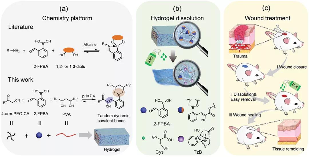 長春應化所陳學思院士、肖春生副研究員基于2-甲酰基苯基硼酸(2-FPBA)開發了串聯動態共價鍵,包括由無催化的Knoevenagel縮合(CKC)反應和硼酸酯形成的動態C=C雙鍵,并以此構建按需溶解的可注射水凝膠(流程 1A)。通過將2-FPBA與氰基乙酸酯末端官能化的4臂PEG(4臂PEG-CA)、聚乙烯醇(PVA)混合制備水凝膠。由于串聯動態共價鍵,所得水凝膠是可注射的。在半胱氨酸存在下,水凝膠通過形成噻唑烷硼酸硼酸鹽(TzB)復合物而迅速溶解(方案 1B)。這種水凝膠可用作治療傷口的敷料,并實現了快速傷口閉合及按需溶解(方案 1C)。文章“Injectable Self‐Healing Hydrogel Wound Dressing with Cysteine‐Specific On‐Demand Dissolution Property Based on Tandem Dynamic Covalent Bonds”發表在《Advanced Functional Materials》上。