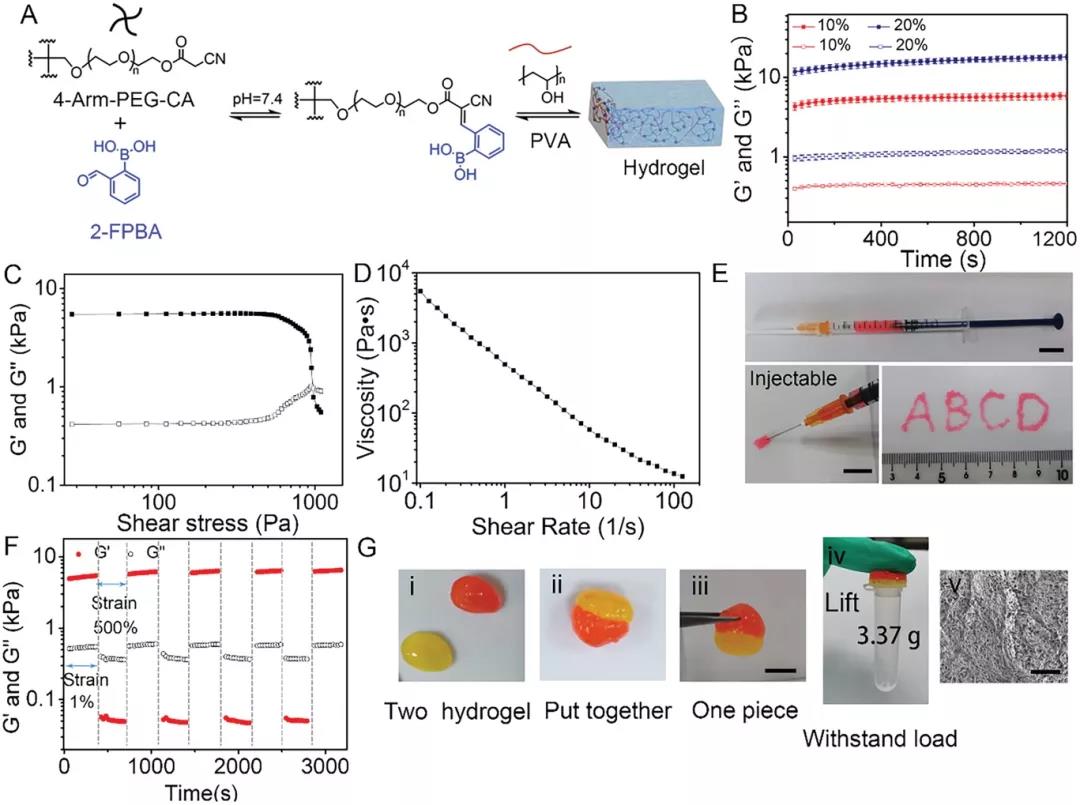 圖1, A)2-FPBA和mPEG-CA反應形成mPEG-CA-BA,半胱氨酸誘導mPEG-CA-BA的解離。B,C)mPEG-CA和2-FPBA在37°C時反應時,UV-vis吸收光譜。D)半胱氨酸處理10分鐘后2-FPBA,mPEG-CA,2-FPBA和mPEG-CA的混合物以及2-FPBA和mPEG-CA的混合物的1 H NMR光譜.E)半胱氨酸處理10分鐘后2-FPBA和mPEG-CA混合物的ESI-MS光譜。F)在指定的小分子存在下,反應混合物中(2-FPBA)單體消失圖。【2-FBC水凝膠的凝膠化、注射性、和自愈能力】接下來,作者通過將4-臂PEG-CA聚合物、2-FPBA和PVA水溶液在pH 7.4的PBS溶液中混合來制備2-FBC水凝膠(圖 2A)。在10 s內形成水凝膠,且其儲能模量隨聚合物濃度的增加而增加(圖 2B)。水凝膠表現出剪切稀化和自修復的性能。當剪切應力超過1000 Pa時,G'低于G'',表明2‐FBC水凝膠網絡在高應力下破裂(圖2C)。當剪切速率從0.1增至100 s-1時,水凝膠的粘度急劇降低,說明良好的剪切稀化特性(圖2D-2E)。水凝膠在500%應變時,G'立即降至0 Pa,水凝膠網絡被破壞;當應變轉變為1%時,其模量在幾秒鐘內完全恢復(圖2F)。水凝膠可以被提起并承受3.37 g的載荷(圖 2G)。這些結果證實了2-FBC水凝膠具有快速凝膠化,優異的注射性和有效的自愈能力,這有利于傷口的愈合。