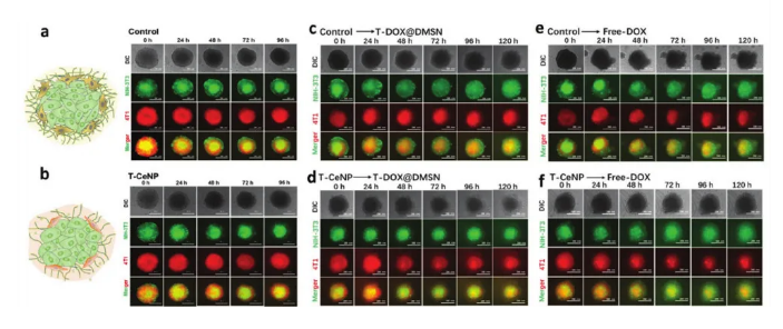 氧化鈰納米粒子(CeNPs)的仿生酶活性主要傾向于超小粒徑和裸露的表面。不幸的是,這兩個特點不利于其在體內(nèi)的應(yīng)用,因為容易聚集和快速腎臟過濾。為了充分利用CeNP的抗癌活性,美國南卡羅萊納大學(xué)Peisheng Xu等人開發(fā)了一種同源靶向氧化鈰納米顆粒系統(tǒng)--靶向CeNP (T - CeNP),該系統(tǒng)整合了生物可降解的樹枝狀介孔二氧化硅納米顆粒、類超氧化物歧化酶和過氧化氫酶的CeNP,以及癌細胞膜的偽裝涂層。