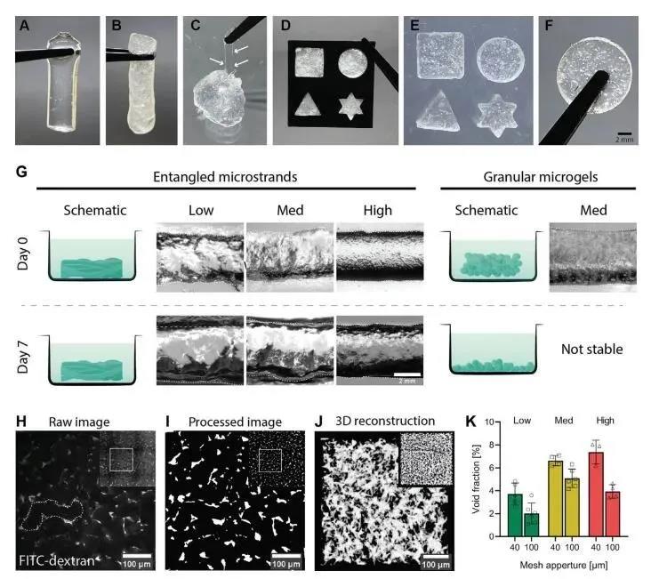 為了研究3D打印纏結微束型凝膠的可調性,研究者通過調整UV交聯時間(20s、60s、180s)制備了一系列不同交聯強度的HA-MA體系凝膠。對比顆粒水凝膠,37℃下浸泡于PBS 7天中,塊體微凝膠在1h內瓦解掉,而纏結微束型水凝膠在水介質中具有長期的凝聚力。為了評估HA-MA纏結微束型凝膠的孔隙率,研究者將凝膠浸入高分子量葡聚糖熒光染料中。由于葡聚糖的分子量較大,圖2H顯示出熒光標記的葡聚糖只能進入凝膠束之間,而無法穿透水凝膠的凝膠相,基于此,研究者可用來計算凝膠的孔隙率(圖2)。