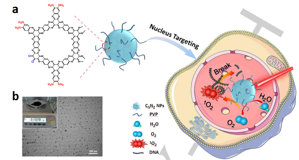 本文要點:(1)實驗通過一步法制備了克級C5N2納米顆粒(NPs)基有機半導(dǎo)體。在650 nm激光照射下,該半導(dǎo)體可裂解水以生成O2,并同時產(chǎn)生單態(tài)氧(1O2),表明在該有機半導(dǎo)體中可以同時作為生成O2的光催化劑和產(chǎn)生1O2的光敏劑(PS)。