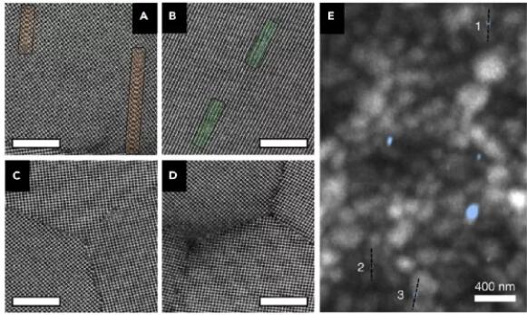鈣鈦礦吸收層中納米級(jí)性能、化學(xué)和結(jié)構(gòu)的異質(zhì)性可視化原子尺度缺陷通過(guò)利用掃描透射電子顯微鏡的低劑量、低角度環(huán)形暗場(chǎng)成像,人們已經(jīng)獲得了FAPbI3和MAPbI3薄膜的原子分辨率圖像,這種原子水平的理解為鹵化鈣鈦礦卓越性能的機(jī)理提供了新的見(jiàn)解。殘留的前驅(qū)體PbI2和FAPbI3晶粒之間具有連貫,無(wú)缺陷,低應(yīng)變的界面,這有助于解釋為什么少量的PbI2可能不會(huì)損害電池性能。同時(shí),鈣鈦礦中相對(duì)未被探索的結(jié)構(gòu)缺陷、但常見(jiàn)的堆積缺陷和刃位錯(cuò)(圖1A和1B),可能對(duì)性能有重要的影響。對(duì)FAPbI3/FAPbI3晶界的研究提供了更深入的了解:雖然大多數(shù)三點(diǎn)晶界是連續(xù)結(jié)晶的,但一些晶界明顯包含非晶態(tài)材料和排列的點(diǎn)缺陷(圖1C和1D)。對(duì)觀察到的結(jié)構(gòu)缺陷進(jìn)行完整、連貫地理解需要更多的工作,重點(diǎn)是結(jié)合光物理信息和模擬的原子分辨率成像,以確定哪些缺陷與材料的穩(wěn)定性和性能最相關(guān)。