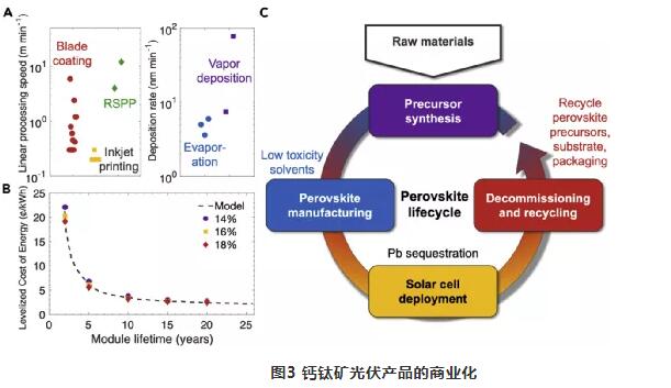 目前,鈣鈦礦領(lǐng)域的主要重點(diǎn)是效率。但是,圖3 B中所示的技術(shù)經(jīng)濟(jì)分析表明,與模組壽命相比,將鈣鈦礦單結(jié)光伏組件的效率從14%-18%改變對(duì)LCOE的影響很小。穩(wěn)定性將在未來(lái)的商業(yè)化努力中占據(jù)中心位置。因此,人們已經(jīng)做出了重大努力,以超越熱力學(xué)不穩(wěn)定的MAPbI3,開(kāi)發(fā)更穩(wěn)定的鹵化物鈣鈦礦成分。除了薄膜之外,還需要更多的努力來(lái)開(kāi)發(fā)用于鈣鈦礦模組的包裝材料,以及專門針對(duì)鈣鈦礦的加速降解測(cè)試協(xié)議。