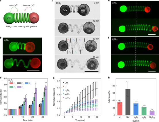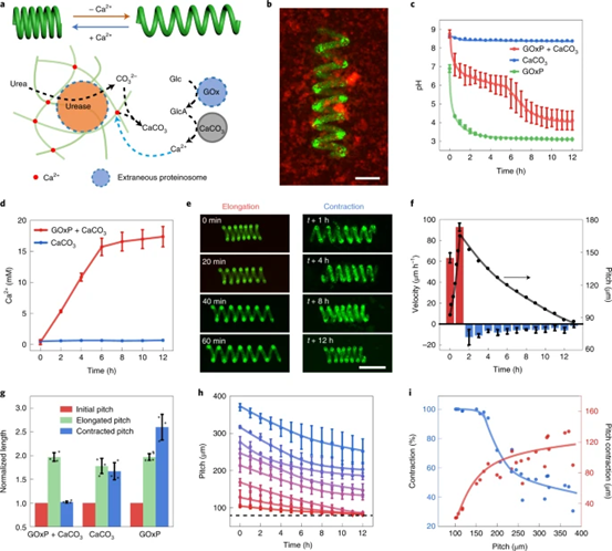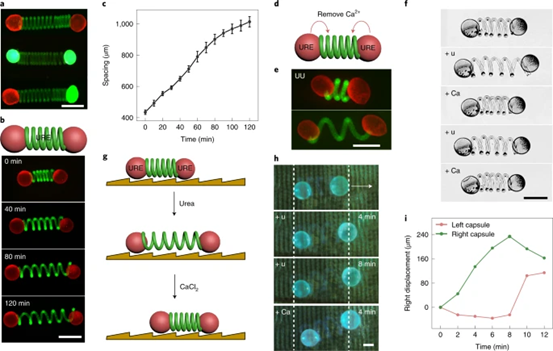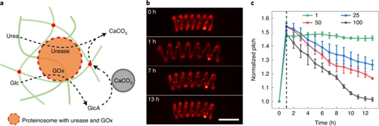 人工細(xì)胞樣群落參與多種化學(xué)相互作用模式,但與當(dāng)?shù)丨h(huán)境的接觸極少。最近,英國(guó)布里斯托大學(xué)Mei Li博士/Stephen Mann院士團(tuán)隊(duì)開(kāi)發(fā)了一種交互式微系統(tǒng),該系統(tǒng)基于將一群酶活性半透性蛋白體固定在螺旋水凝膠絲內(nèi),以實(shí)現(xiàn)信號(hào)誘導(dǎo)運(yùn)動(dòng)。