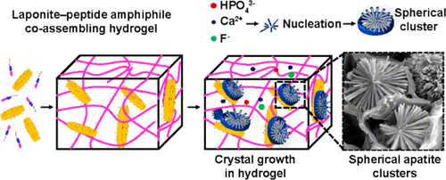 該團(tuán)隊開發(fā)了一種共組裝有機(jī)-無機(jī)水凝膠平臺,用于體外晶體生長,由 3D 超分子限制框架內(nèi)的顆粒附著機(jī)制介導(dǎo)。設(shè)計策略取決于 Lap 納米盤和陽離子 PAH3 分子之間的靜電相互作用,以將有機(jī)和無機(jī)組分的固有特性整合到獨(dú)特的有機(jī)-無機(jī)水凝膠結(jié)構(gòu)中。所得材料顯示出高表面積、高機(jī)械性能和自修復(fù)性能。此外,共組裝的 PA-Lap 水凝膠顯示出一種納米級結(jié)構(gòu),可作為羥基磷灰石從有序納米棒分級生長到明確定義的球形簇的密閉空間。該研究探索了這種礦化機(jī)制,作為一種仿生 3D 模型來調(diào)節(jié)氟化羥基磷灰石的成核和時空組織。