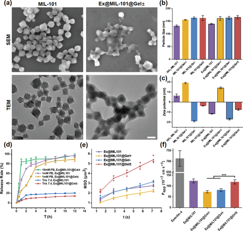 示意圖1 含有 Ex@MIL101@Gel± 納米顆粒用于口服 exendin-4 遞送的 pH 觸發自解包膠囊的圖示。通過丙烯酰改性的 NH2-MIL101納米粒子、NIPAM 和 MPDMSA 以 GDA 作為交聯劑的自由基共聚,獲得含有 exendin-4 的水凝膠涂層 MOF 納米粒子。膠囊保護載有肽的納米粒子免受胃的酸性環境的影響,并在腸道中解包,產生二氧化碳氣泡以促進納米粒子的運動。納米顆粒的兩性離子表面進一步有助于穿過腸道上皮層的運輸。