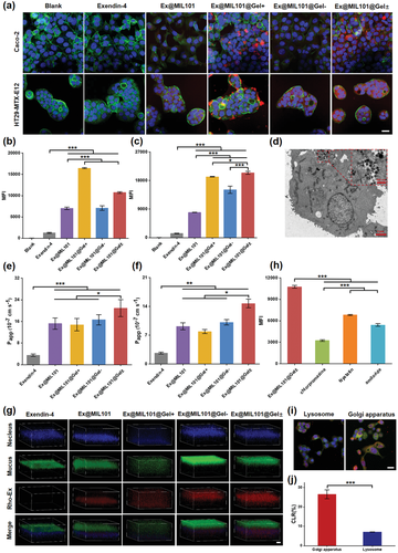 此外,MOF-Gel 納米顆粒顯示出超過 40% 的高 exendin-4 負載含量,并且肽在含有磷酸鹽的溶液中快速釋放。與沒有水凝膠殼或帶單電荷水凝膠殼的 MOF 納米顆粒相比,具有兩性離子水凝膠殼的 MOF 納米顆粒顯示出增強的粘液滲透和 Caco-2 和 E12 細胞的細胞內化。基于熒光成像,在空腸注射到 BALB/c 裸鼠后,含有羅丹明 B 標記的 exendin-4 的 Ex@MIL101@Gel± 納米顆粒與游離的 exendin-4 相比表現出增強的腸道 exendin-4 吸收。此外,Au@MIL101@Gel±@Cap 的口服給藥進一步證實了口服給藥的 MOF-Gel 納米顆粒的有效腸道吸收。在糖尿病大鼠模型中口服給藥后,Ex@MIL101@Gel±@Cap 導致血漿 exendin-4 水平顯著升高,有效刺激內源性胰島素分泌,對糖尿病大鼠產生顯著的降血糖作用,具有顯著的降血糖作用。相對藥理利用率為 17.26%。與口服胰島素治療相比,使用 exendin-4 發生低血糖的風險較低。包括水凝膠包覆的MOF納米顆粒和pH響應膠囊在內的載體材料可以輕松獲得,高DLE和exendin-4顯著增強的口服利用度促進了成本節約,同時為糖尿病患者提供了極大的便利和依從性優勢.因此,含有兩性離子水凝膠包被的 MOF 納米顆粒的腸道環境觸發的自解包膠囊作為載體具有巨大的潛力,可以克服口服肽遞送以有效治療糖尿病的關鍵障礙。