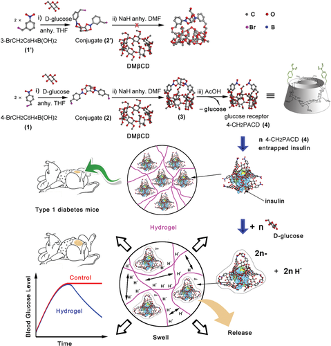 雙齒 β-CD 通過三個簡單的反應很容易合成,從 DMβCD 和對(溴甲基)苯基硼酸開始。雙齒β-CD的形成過程被發現是尺寸選擇性的,因為從間(溴甲基)苯基硼酸試劑中,不能提供雙齒β-CD衍生物。雙齒 β-CD(即 4-CH2PACD)包含葡萄糖狹縫,并顯示出與 D-葡萄糖的高效特異性結合。合成的 4-CH2PACD 被摻雜到 PAAm 水凝膠中,賦予水凝膠對 D-葡萄糖的特異性反應。具體而言,當凝膠在 D-葡萄糖溶液中平衡時,水凝膠的膨脹是可見的,而在 D-葡萄糖異構體(如 D-果糖和 D-半乳糖)溶液中則收縮。發現這種特征有利于自我調節的特定葡萄糖響應性胰島素釋放,因為溶液中高濃度的 D-葡萄糖會導致凝膠膨脹并增加網格尺寸。體內試驗表明,在 T1DM 中預加載雙齒 β-CD 和短活性胰島素的 PAAm 水凝膠能夠實現長期持續的血糖控制。預計這種簡便的合成方法將為雙齒 β-CD 作為各種重要生物化合物或代謝物的受體的合成打開一扇新的大門。考慮到 β-CD 與許多生物或藥物活性化合物之間的多功能主客體內含物,以及雙齒 β-CD 與靶向生物分子之間的特定相互作用,為 DSGTIR 開發了一種新機制。