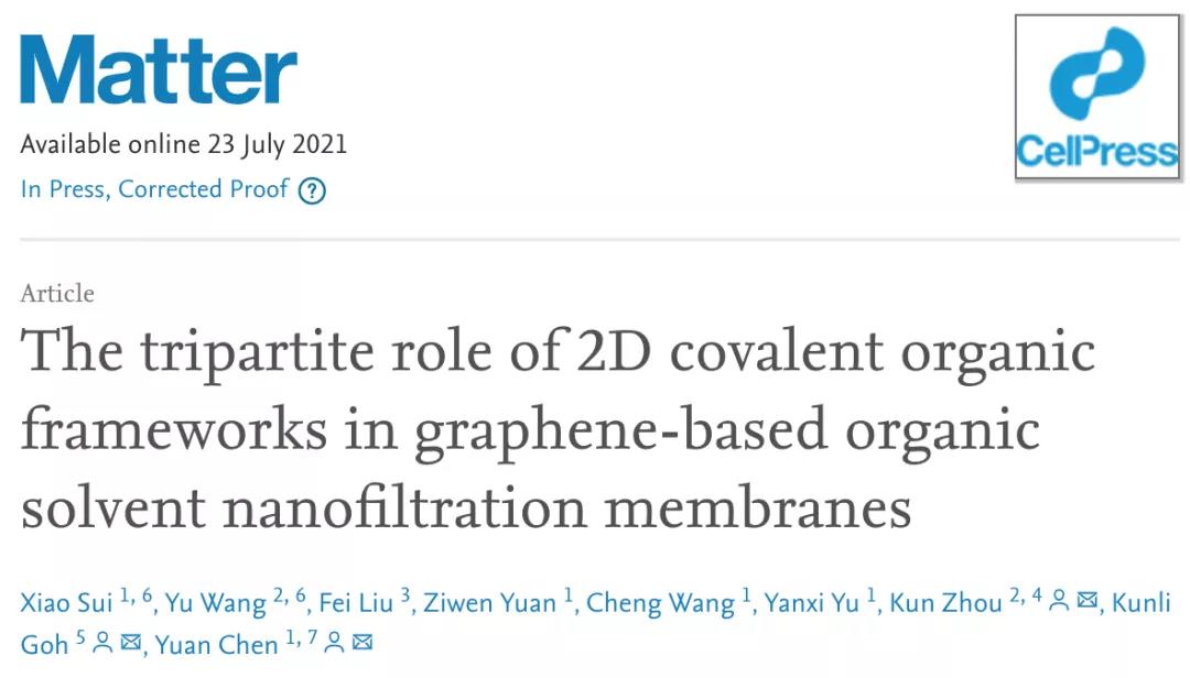 二維COF在石墨烯有機(jī)物分離納濾膜中的三重作用第一作者:隋瀟, 王彧通訊作者:陳元 *,吳昆勵(lì) *,周琨*單位:悉尼大學(xué),新加坡膜科學(xué)研究中心,南洋理工大學(xué)