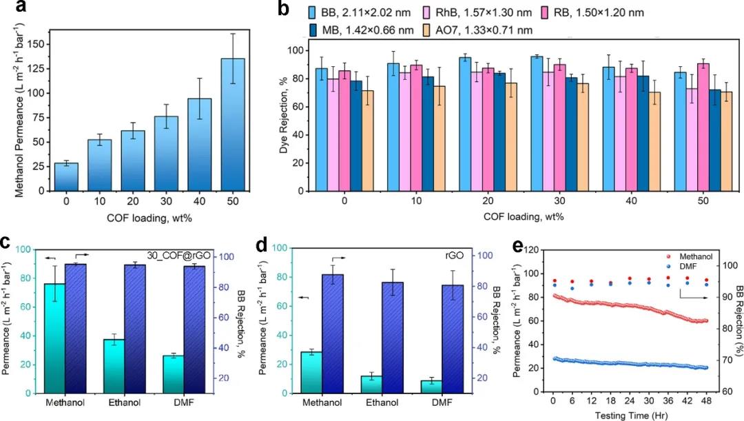 插入二維COF后的雜化薄膜在不同有機(jī)溶劑體系下的性能均高于未插入COF的純r(jià)GO薄膜。