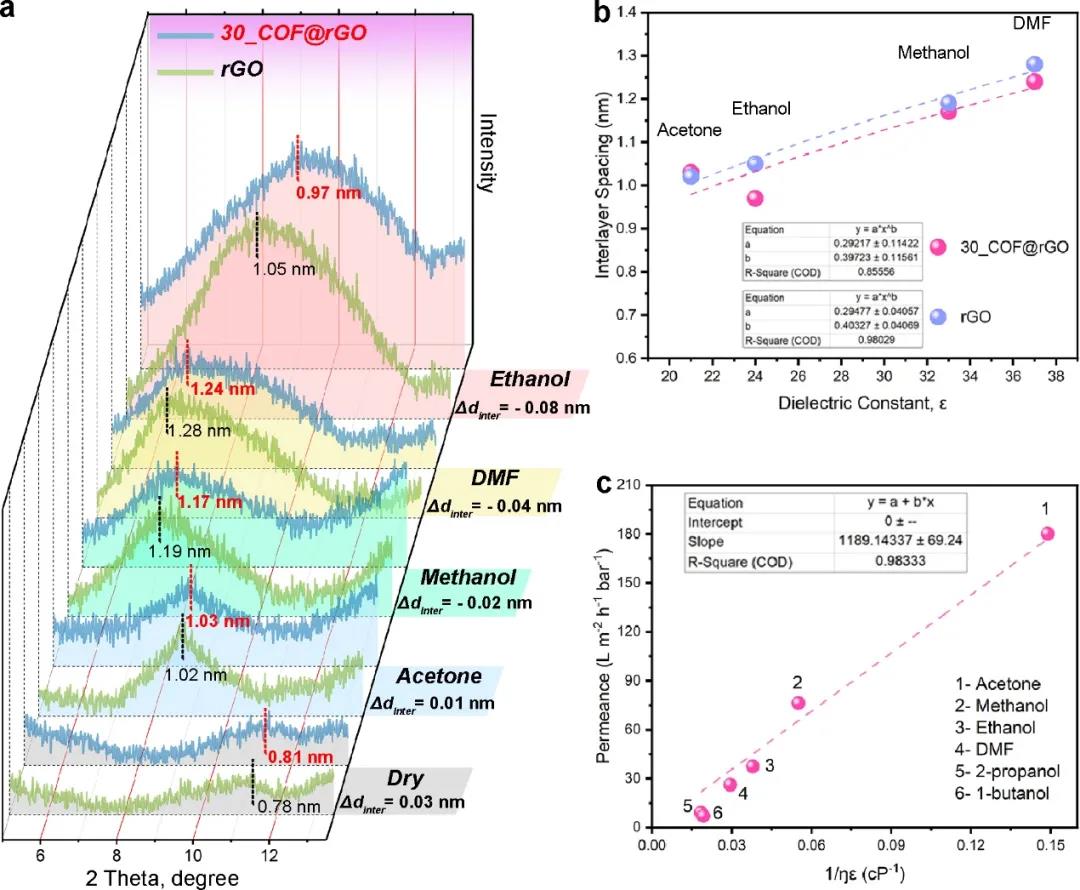 XRD結(jié)果表面,干燥條件下,插入COF的雜化薄膜的層間距大于純r(jià)GO薄膜。然而,在不同有機(jī)溶劑中,插入COF的雜化薄膜的層間距不但沒有大于,反而小于或者接近于純r(jià)GO薄膜的層間距。這表明COF的插入可以緩解層間距在有機(jī)溶劑中的溶脹,從而加強(qiáng)穩(wěn)定性。并且,溶劑的通量和溶劑的粘度和介電常數(shù)密切相關(guān)。