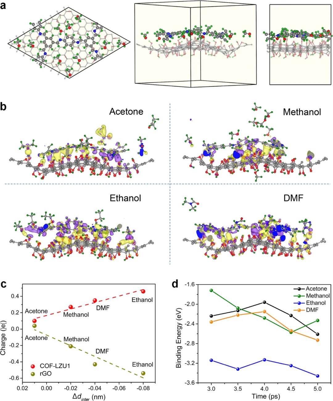 計(jì)算結(jié)果表明,COF可緩解rGO層間距在有機(jī)溶劑中的溶脹是因?yàn)槿芤赫T發(fā)了電荷在COF/rGO界面的重新排布。這個(gè)電荷排布導(dǎo)致了一個(gè)在COF與rGO之間的吸引力的產(chǎn)生。并且在不同溶劑中的吸引力大小不一樣,從而導(dǎo)致層間距在不同溶劑中的不同。