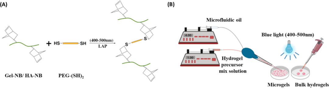 圖4(A)巰基-降冰片烯點(diǎn)擊反應(yīng)示意圖;(B)塊狀水凝膠和微凝膠制備示意圖