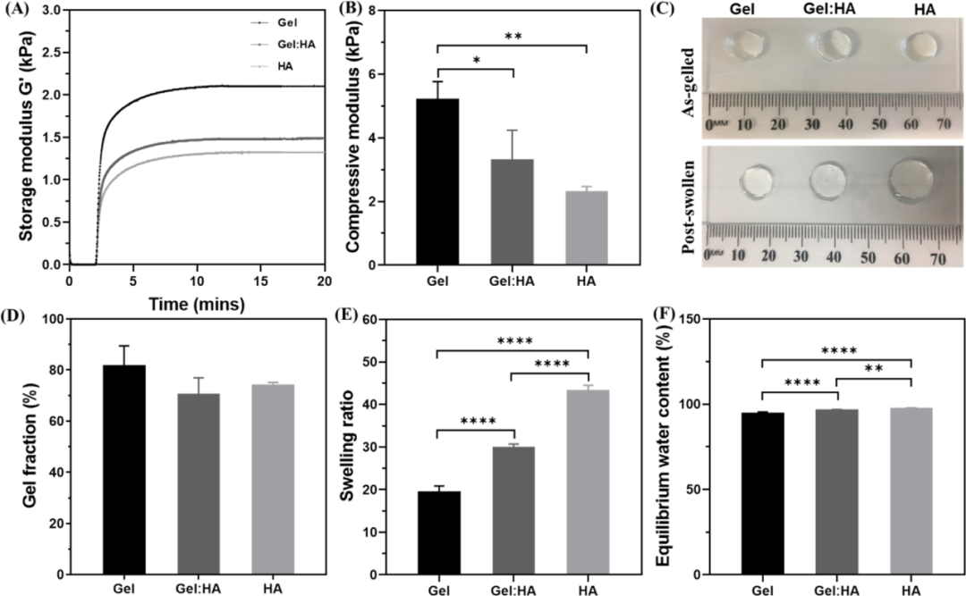 首先,作者設(shè)計(jì)了三種不同的含有硫醇功能化PEG (PEG-(SH)2)的水凝膠,并與降冰片功能化明膠(Gel-NB)或降冰片功能化透明質(zhì)酸(HA-NB)或Gel-NB和HA-NB的混合凝膠混合使用。水凝膠的光交聯(lián)動(dòng)力學(xué)通過(guò)原位光流變學(xué)進(jìn)行監(jiān)測(cè),結(jié)果顯示,無(wú)論水凝膠組成如何,光暴露的幾秒鐘內(nèi)就能迅速形成凝膠。從壓縮測(cè)試中得到的應(yīng)力-應(yīng)變曲線可知,Gel、Gel:HA和HA水凝膠的壓縮模量分別為5.2、3.3和2.3 kPa,與存儲(chǔ)模量的變化趨勢(shì)相同。這些數(shù)據(jù)表明,水凝膠的硬度呈現(xiàn)出Gel>Gel:HA> HA的趨勢(shì)。由于高含水量的水凝膠往往比含水量少的水凝膠更軟,HA和明膠親水性的差異也可能導(dǎo)致由它們形成的水凝膠的力學(xué)性能的差異(圖2)。