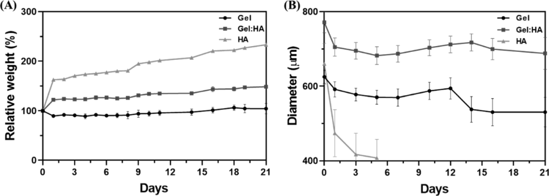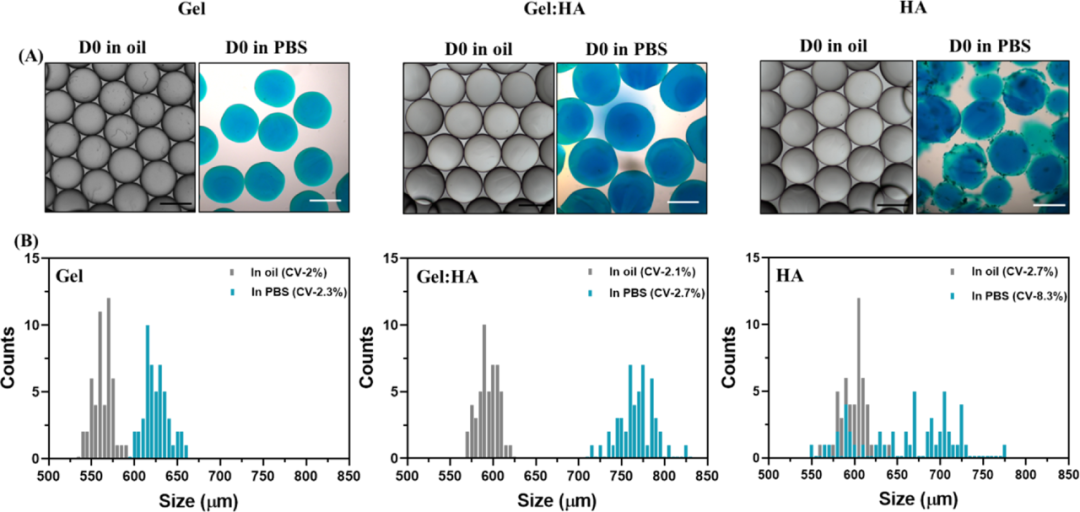 接下來(lái),作者使用基于移液管的微流體技術(shù)合成Gel、Gel:HA和HA微凝膠。對(duì)微凝膠的大小和分布進(jìn)行了表征。Gel:HA微凝膠與在塊狀水凝膠中觀察到的溶脹一致,都?xì)w因于HA的高親水性(圖3)。