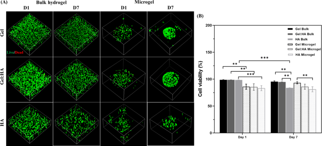 為了了解水凝膠對(duì)細(xì)胞培養(yǎng)的穩(wěn)定性和適宜性,作者測(cè)定了三種水凝膠制劑在大體積和微凝膠狀態(tài)下的體外降解率。與塊狀水凝膠相比,在DPBS中Gel:HA和HA水凝膠的質(zhì)量顯著增加。所有體積水凝膠的凝膠質(zhì)量在10天內(nèi)保持相對(duì)穩(wěn)定。10天后,觀察到所有水凝膠成分的質(zhì)量逐漸增加,HA 增加的比例更高。同時(shí)微凝膠的降解性能與整體水凝膠有顯著差異。微凝膠與塊狀水凝膠的比表面積的增加增加了傳質(zhì)導(dǎo)致塊狀水凝膠更快的降解,這種效應(yīng)對(duì)于高親水性的HA微凝膠更為明顯,可能是由于較高的溶脹程度(圖4)。