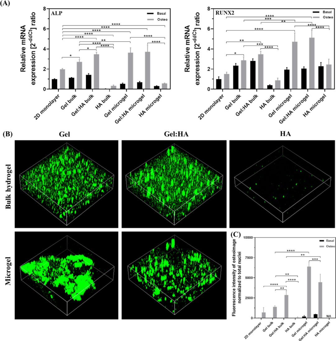 為了確定水凝膠組成和幾何形狀對(duì)間充質(zhì)干細(xì)胞分化的影響,所有組成的體積水凝膠和微凝膠均在基礎(chǔ)培養(yǎng)基和骨誘導(dǎo)培養(yǎng)基中培養(yǎng)7天。與基礎(chǔ)培養(yǎng)相比,骨誘導(dǎo)培養(yǎng)中ALP和RUNX2基因表達(dá)明顯上調(diào),表明hBMSC成功分化為成骨細(xì)胞系。此外,Gel和Gel:HA內(nèi)的hBMSC成骨誘導(dǎo)培養(yǎng)中ALP和RUNX2的表達(dá)明顯高于2D單層細(xì)胞培養(yǎng)。這強(qiáng)調(diào)了3D平臺(tái)相對(duì)于2D平臺(tái)的優(yōu)勢(shì)。相反,HA水凝膠不支持成骨。同樣的,與塊狀凝膠相比在微凝膠中ALP表達(dá)也明顯增高(圖7)。