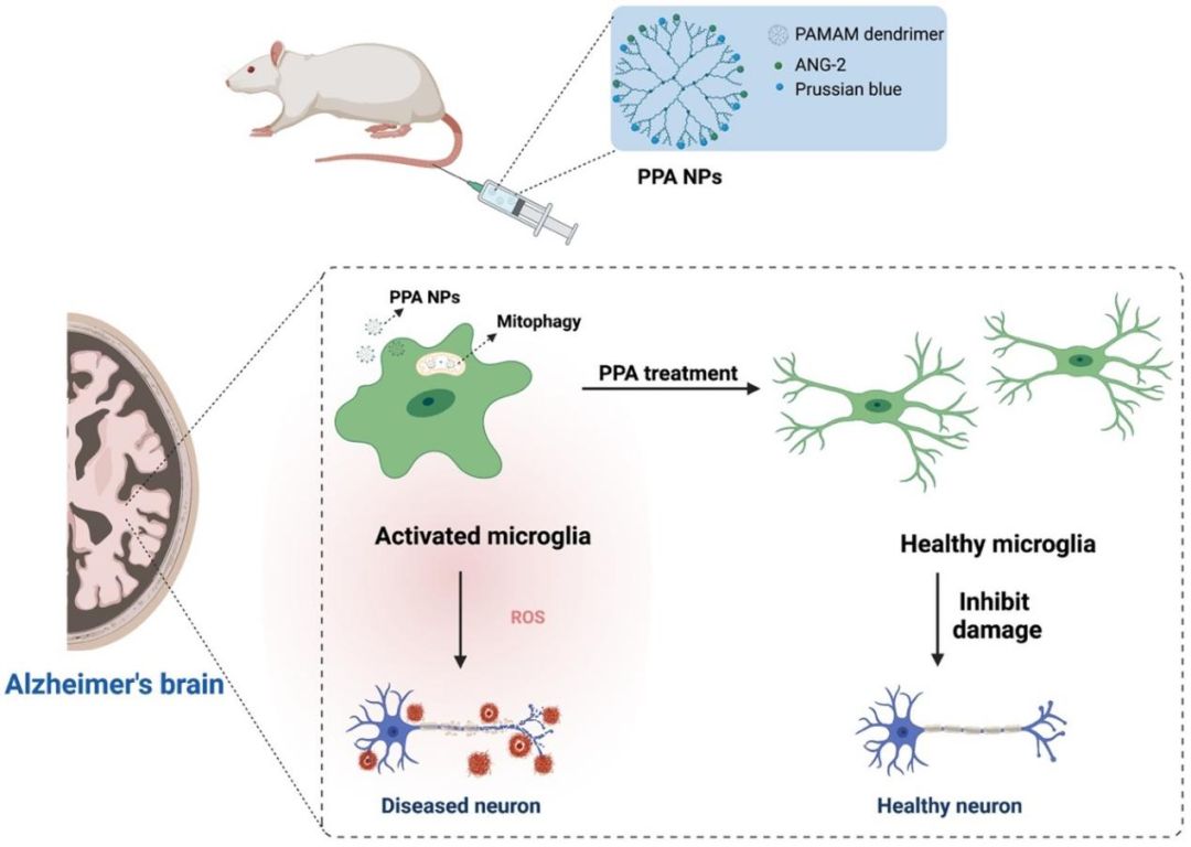 目前專注于抑制Aβ聚集的阿爾茨海默病 (AD) 治療未能在已經(jīng)出現(xiàn)阿爾茨海默病癥狀的人群中顯示出有效性。協(xié)同發(fā)揮神經(jīng)保護(hù)作用和緩解氧化應(yīng)激的策略可能是糾正病理性腦微環(huán)境的一種有前途的方法。基于小膠質(zhì)細(xì)胞在調(diào)節(jié)AD微環(huán)境中的關(guān)鍵作用,我們?cè)诖嗣枋隽似蒸斒克{(lán)/聚酰胺胺 (PAMAM) 樹(shù)枝狀大分子/Angiopep-2 (PPA) 納米顆粒的開(kāi)發(fā),該納米顆粒可以調(diào)節(jié)小膠質(zhì)細(xì)胞的線粒體自噬,作為潛在的 AD 治療。PPA 納米粒子表現(xiàn)出優(yōu)異的血腦屏障 (BBB) 滲透性,并發(fā)揮 ROS 清除和恢復(fù)小膠質(zhì)細(xì)胞線粒體功能的協(xié)同作用。PPA 納米粒子有效減少神經(jīng)毒性 Aβ 聚集體并拯救 APP/PS1 模型小鼠的認(rèn)知功能。總之,我們的數(shù)據(jù)表明,這些多功能樹(shù)枝狀大分子納米粒子表現(xiàn)出有效的神經(jīng)保護(hù)和小膠質(zhì)細(xì)胞調(diào)節(jié),可作為治療 AD 的有前景的方法。