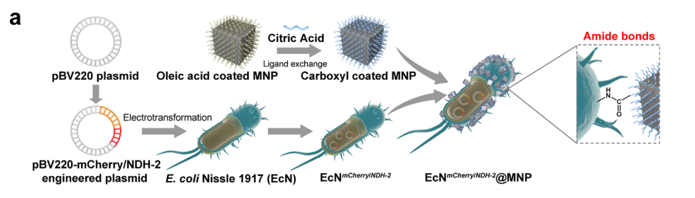 微機(jī)器人系統(tǒng)有三個(gè)關(guān)鍵元素,包括磁性納米顆粒(MNP)加載益生桿菌尼氏1917(EcN@MNP)空間磁和缺氧感知,熱邏輯電路設(shè)計(jì)到細(xì)菌控制mCherry的生物合成溫度和定位記者,和NDH-2酶編碼的增強(qiáng)抗癌治療。根據(jù)基于熒光蛋白的成像反饋,該微機(jī)器人對(duì)腫瘤區(qū)域表現(xiàn)出良好的熱敏感性和主動(dòng)靶向能力