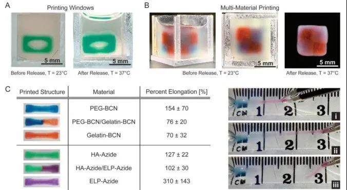 The article mainly uses a gel suspension bath for printing. The shear-thinning gel support material is mixed with a cross-linking agent. The extrusion nozzle extends into the bio-ink extruded below the liquid surface to construct a 3D structure. At the same time, the cross-linking agent is small. The molecules begin to diffuse into the bio-ink, and the SPAAC reaction occurs at the same time, and finally solidifies through cross-linking to obtain a complete three-dimensional solid hydrogel structure. The article uses this method to print window structure, multi-material square and multi-material tensile structure.