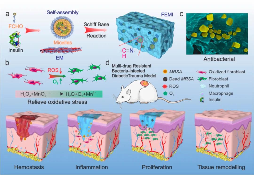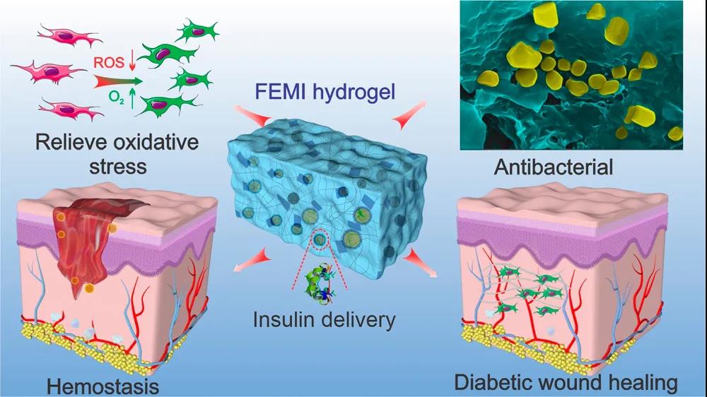 In order to cope with the problems of bacterial infection, high oxidation and high blood sugar in diabetic wounds, Professor Zhang Qiuyu's team from Northwestern Polytechnical University developed an injectable water based on aldehyde modified F127 micelles/polylysine coated manganese dioxide Gel (FEM hydrogel). The polylysine in the hydrogel system has antibacterial properties, the reducing properties of manganese dioxide are used to neutralize oxidizing substances, and F127 can contain insulin for lowering blood sugar. Related research paper: Nanoenzyme-Reinforced Injectable Hydrogel for Healing Diabetic Wounds Infected with Multidrug Resistant Bacteria was published in the journal Nano Letters.