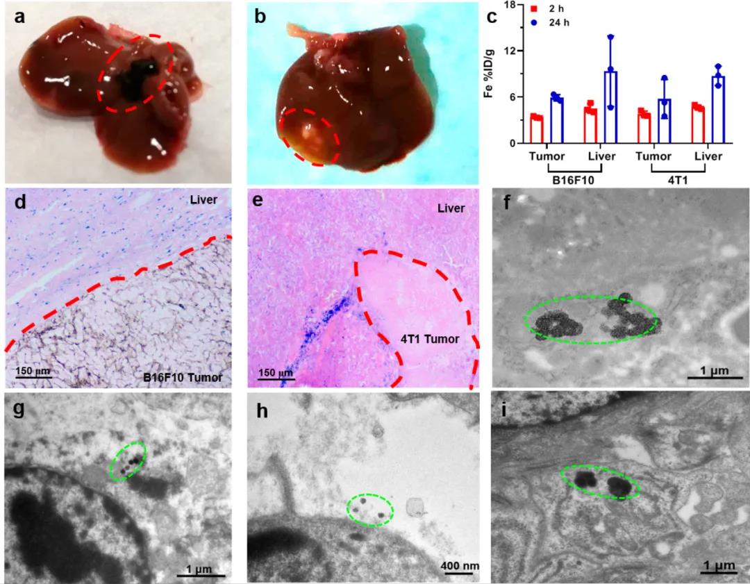 1) HIONPs as T1 contrast agents (CA) can significantly enhance the MRI signal of tumor metastasis, and when they aggregate into clusters of high glutathione in the liver, they significantly reduce the signal of liver T2 CA. Therefore, the MRI contrast of HIONPs clearly distinguishes the metastatic tumor (bright) from the surrounding liver tissue (dark).