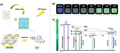 Fig. 3a) fluorescence response of ma-ipa in 1 to of. b) The photo of 1 taken from of solution was emitted, and the concentration increased from 10-9 to 10-3 M. c) Fluorescence response of ma-ipa in 1 to of mechanism (ISC: cross between systems)