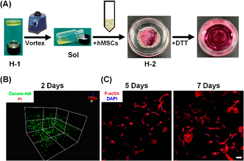 Figure 3. Cell encapsulation, distribution and growth( A) The schematic diagram depicts the trapping of cells in H-2( B) The maximum projection of human mesenchymal stem cells encapsulated 48 hours after confocal microscopy in H-2( C) After H-2 degradation, hMSCs were cultured for 5 and 7 days.